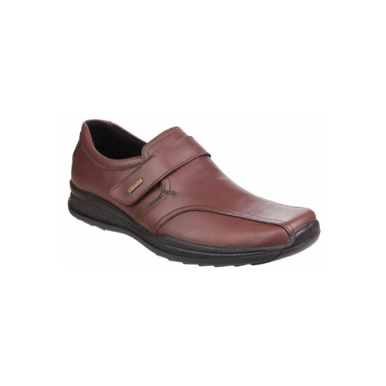 – Mens shoes.- Single touch fastening bar strap over gusseted tongue.- Mirtex waterproof lining keeps feet dry and comfortable whilst remaining breathable.- Formal styling featuring a plain toe front.- Lightweight and flexible man-made sole.- Features subtle padded Achilles heel strip and collar for all day comfort and support.- Upper: Leather.- Lining: Textile.- Sole: PU..- Gender: Men
